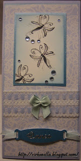 Koristeena strasseja, pitsiä, rusetti ja nauhaa. Teksti ääriviivatarra.
